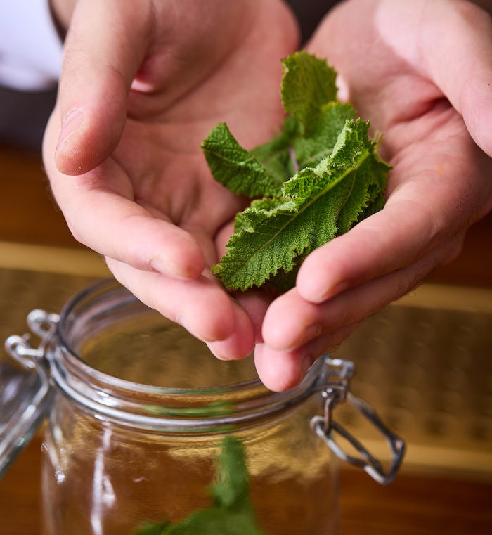 “The spirit we make now is a very simple maceration of grated British wasabi, foraged black mustard and shiso leaves into neutral grain,” says Bafas, who adds that the trick for maximising flavour in this fresh herb infusion is to oxidise the leaves before steeping in alcohol (oxidise by gently rubbing the herb with your hands). “The oxidisation process allows more aromas to be released from the leaves, contributing to a richer, more pungent infusion.”