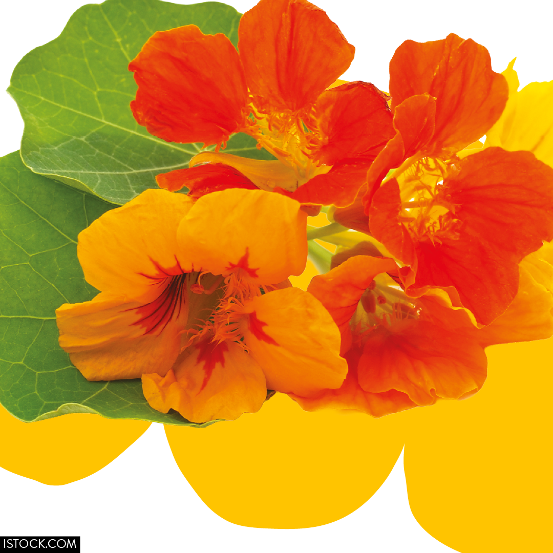 Nasturtiums are a popular culinary and drink garnish. They begin to emerge in late spring and are available for m0st of the year. The leaves are uniquely round and have a prismatic effect when sprayed with a mist or holding a droplet of liquid (like the ones atop Erik Lorincz’s Garden Martini at Kwãnt in Mayfair). The flowers range from pale yellow to orange to red to maroon, with solid and variegated blooms and impart a hint of sweetness along with the characteristic pepper.